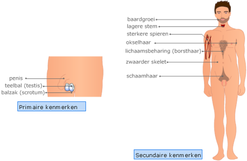 In de afbeeldingen zie je primaire en secundaire geslachtskenmerken bij mannen.